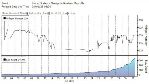 值得一提的是,华尔街对7月非农的“耳语”数字(whisper number)最初为12.5万,到上月中下滑至了11万,随后出现逆转,最近又回到了12万左右,这反映出市场近来对美国就业市场的信心正再度有所增强。耳语数字是在华尔街专业人士中流传的非官方和未公开的预测。