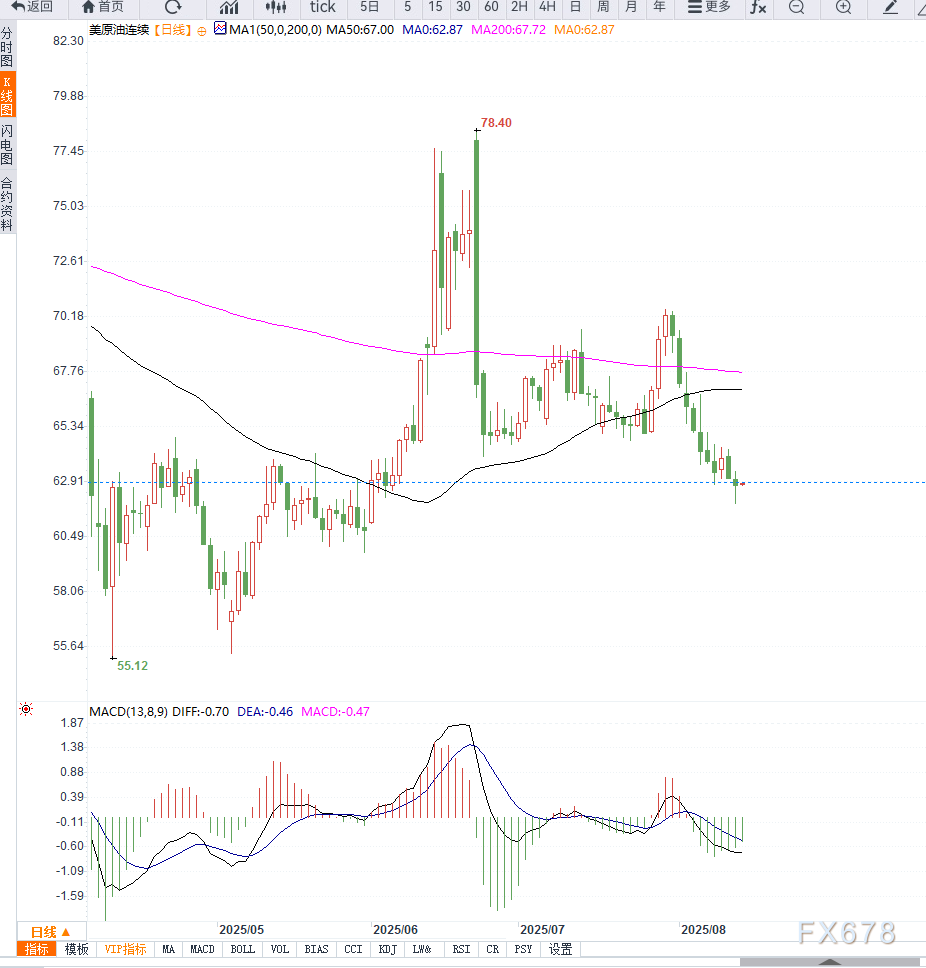 即将举行的美国总统特朗普与俄罗斯总统普京会晤为市场注入风险溢价。特朗普在会前表示,若普京在乌克兰问题上不达成和平共识,将面临“严重后果”,并暗示可能采取经济制裁。   Rystad Energy在报告中指出,美俄谈判的不确定性增加了油市的看涨风险溢价,因为俄罗斯原油买家可能承受更大经济压力。   另一个支撑因素来自美联储9月降息的高预期。美国7月通胀温和上升,加上就业数据疲软,使市场押注美联储在9月16-17日会议上降息的概率接近100%,其中半个百分点的降息可能性也在上升。   美元周四在对欧元和英镑的汇率中维持在数周低位,这为以美元计价的原油提供了价格支撑。   不过,油价上行空间受限。美国能源信息署(EIA)数据显示,截至8月8日当周,美国原油库存意外增加300万桶,市场此前预期为减少27.5万桶。   此外,IEA最新预测2025和2026年全球石油供应增速将超预期,主要原因是OPEC+增产以及非OPEC国家产量提升。   机构观点认为,未来油价走势将更多取决于乌俄局势演变和全球供应增长节奏,如果谈判未达成实质成果或供应继续攀升,油价可能再度承压。   从日线走势看,WTI原油价格在连续下跌后于62.50美元附近获得初步支撑,目前短线反弹至63美元附近,但上方64.20-64.50美元区间存在较强阻力,该区域同时接近20日均线位置。   若价格突破该阻力,或有望向65.50美元发起测试;反之,若跌破62.50美元支撑,可能进一步回落至61.80美元甚至60.50美元一线。技术指标MACD仍位于零轴下方,但红柱开始缩短,显示空头动能有所减弱。