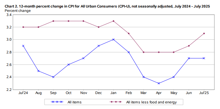 具体数据显示,美国7月消费者价格指数(CPI)环比上升0.2%,与预期一致,较前一月放缓了0.1个百分点;同比涨幅维持在2.7%,市场原先预期会上升至2.8%,结束近两个月的反弹势头。