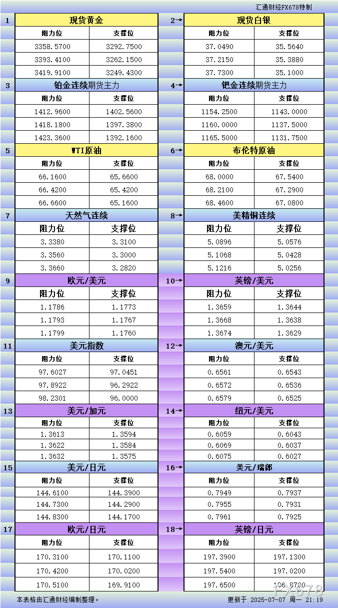 嘉盛外汇官网:7月7日美市更新支撑阻力:18品种支撑阻力(金银铂钯原油天然气铜及