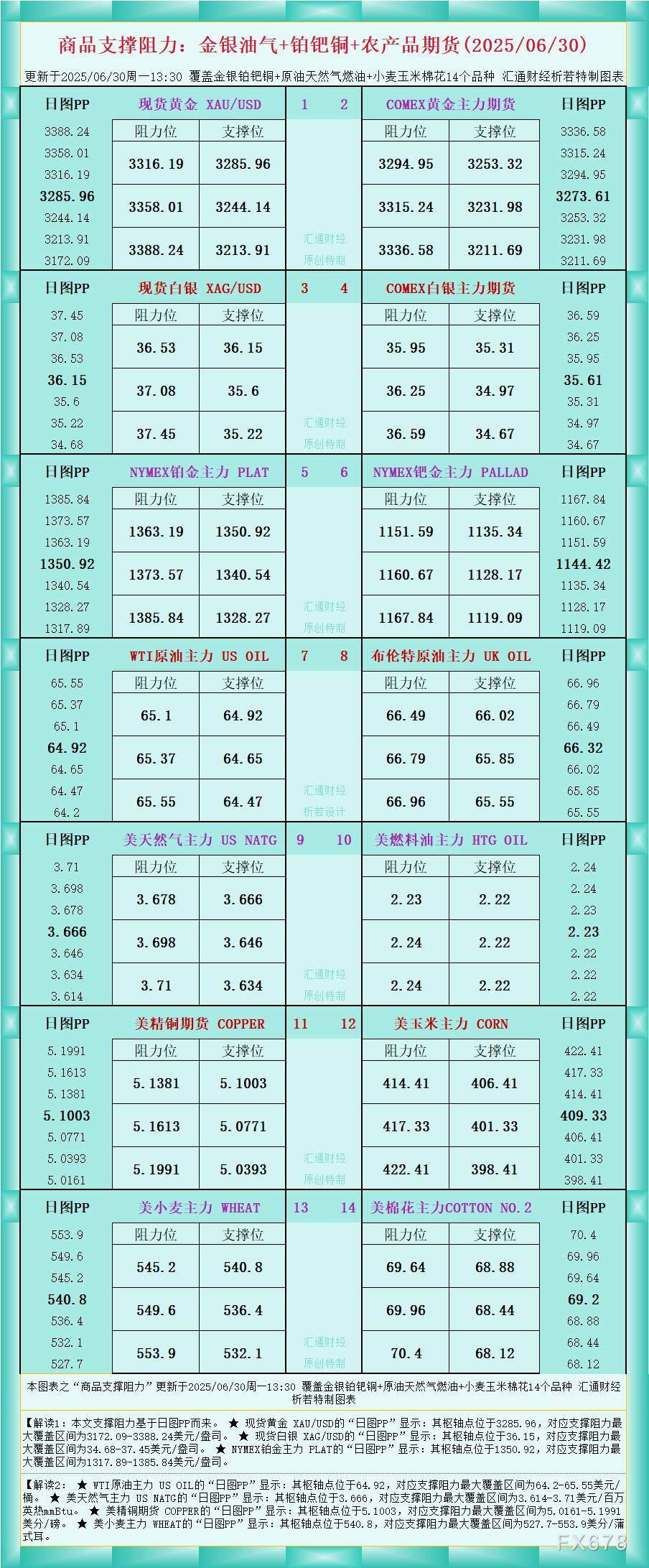 一张图看商品支撑阻力:金银油气+铂钯铜+农产品期货,更新于2025年6月30日周一13:30,具...